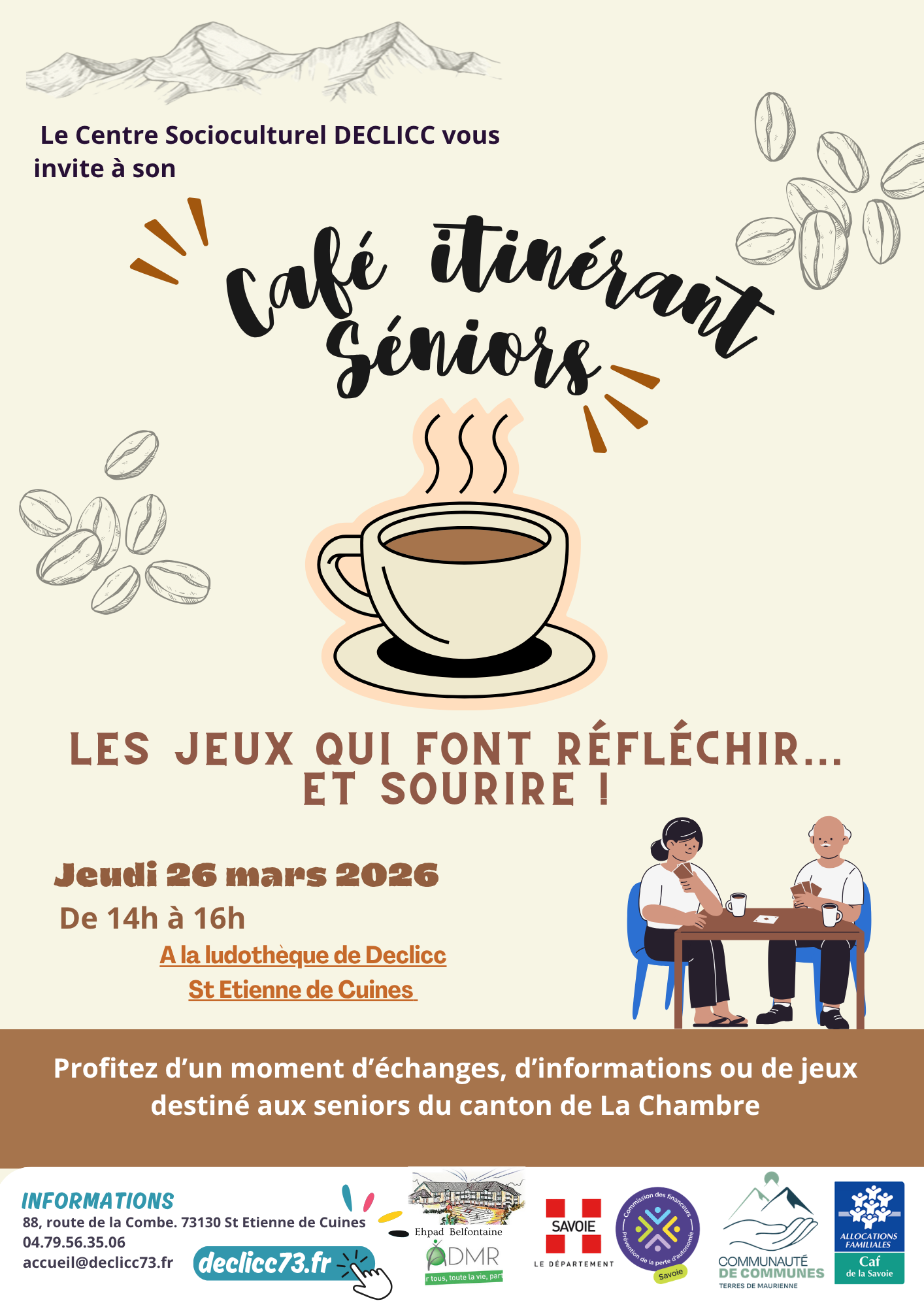 Le Centre Socioculturel DECLICC vous invite à un nouveau Café itinérant Séniors, le jeudi 26 mars 2026 de 14h à 16h, à la ludothèque de Declicc.