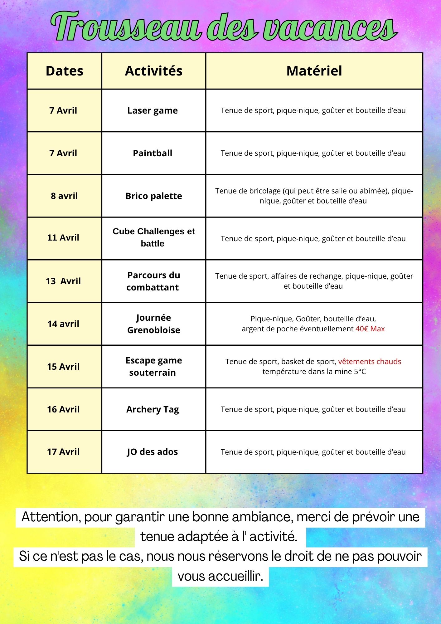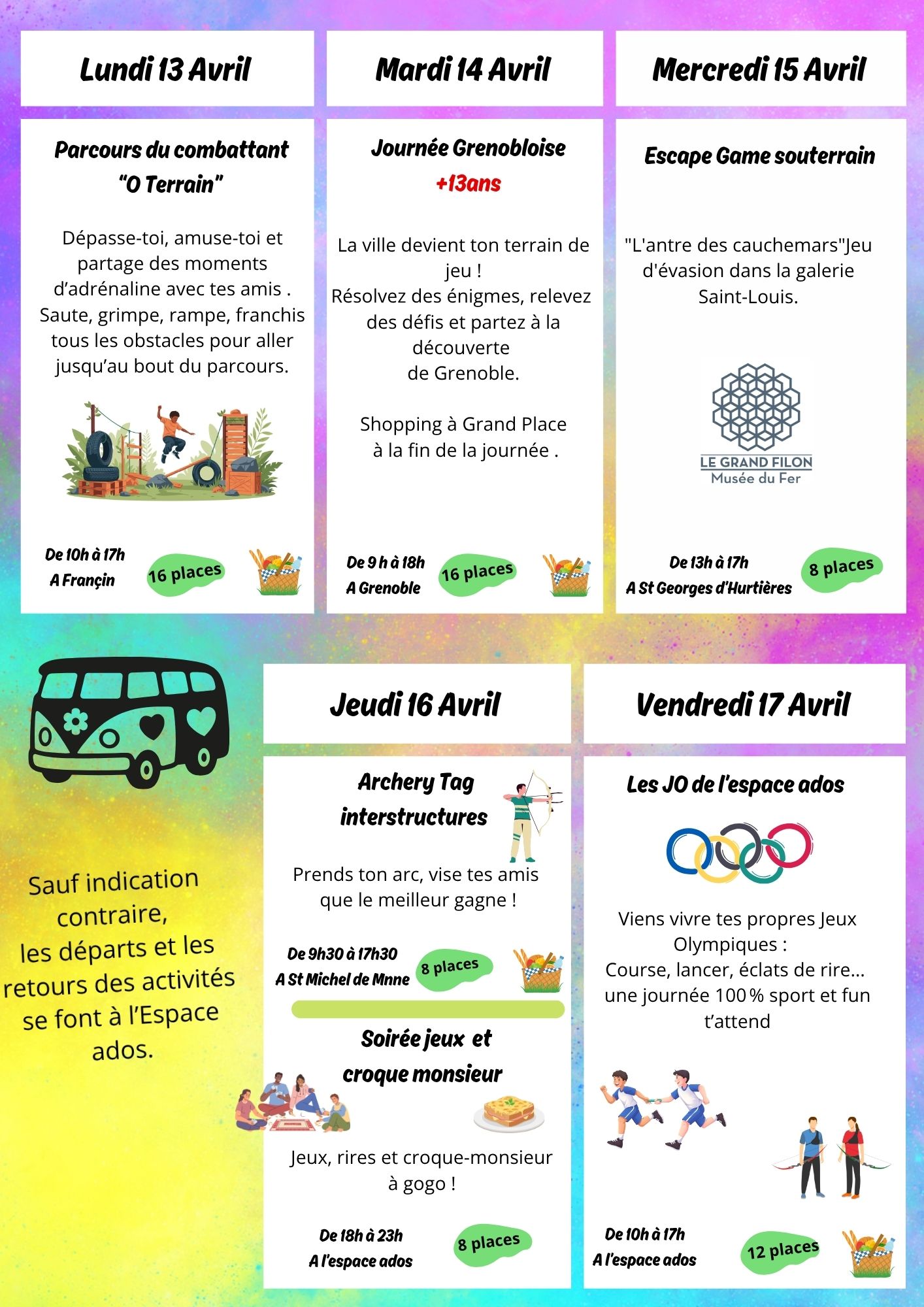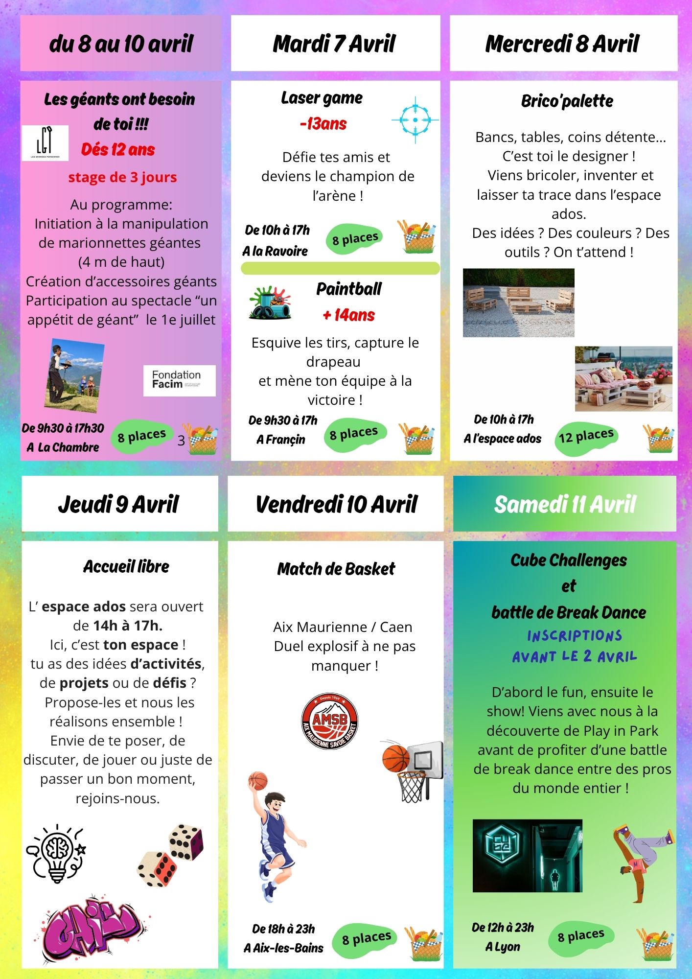 Laser game, paintball, marionnettes géantes, journée grenobloise, archery tag, escape game souterrain, JO des ados… et plein d’autres moments à partager ensemble du 7 au 17 avril.